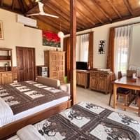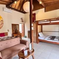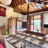 Deze bijzonder ruime kamer biedt een comfortabel tweepersoonsbed en een extra eenpersoonsbed.Geniet van een luxe badkamer, airconditioning, een gezellige zithoek met tafel, en twee heerlijke terrassen met zit- en lounge plekken, omringd door onze weelderige rijstvelden.
